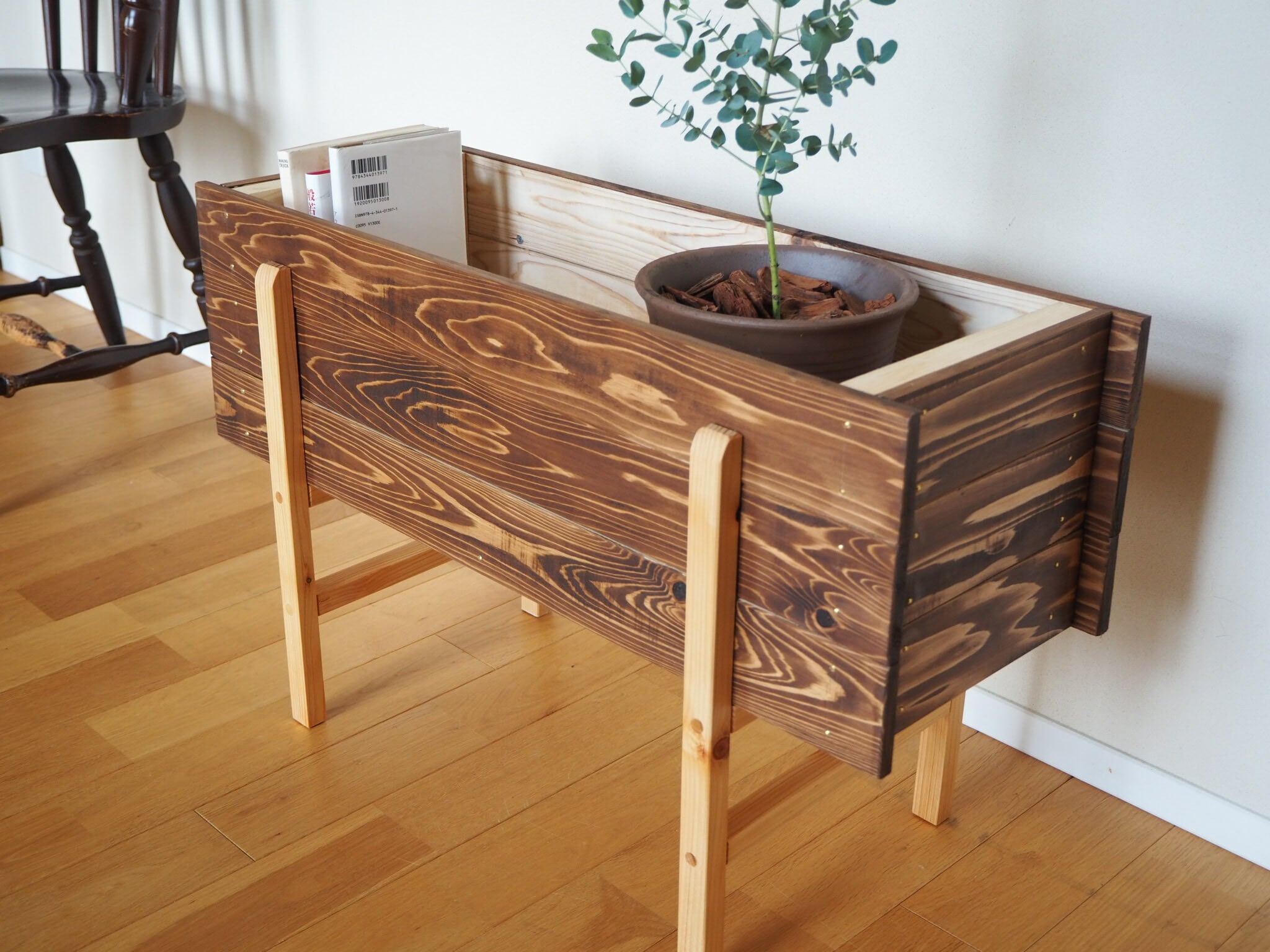 本棚としても使用できる室内無垢材プランターBOX