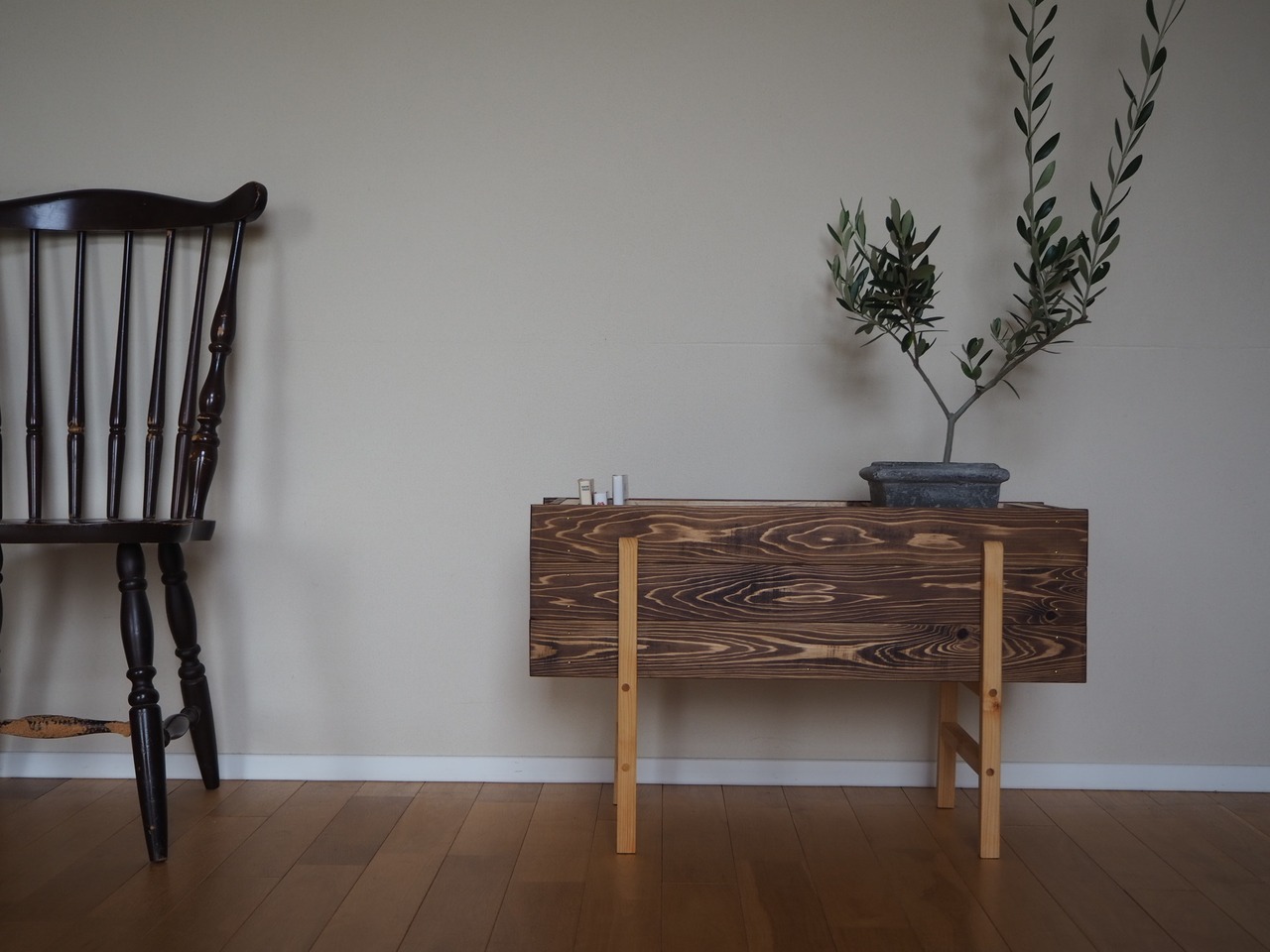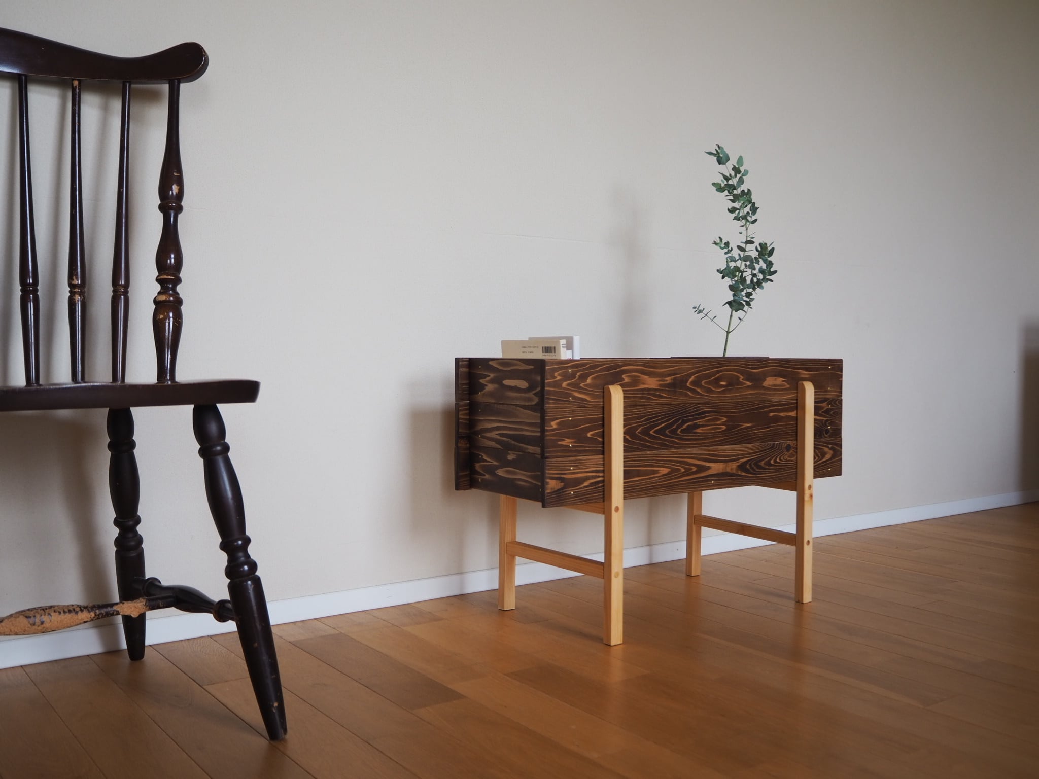 濃い色合いをつけた杉板で枠を作り、桧無垢材で脚を取り付けております。