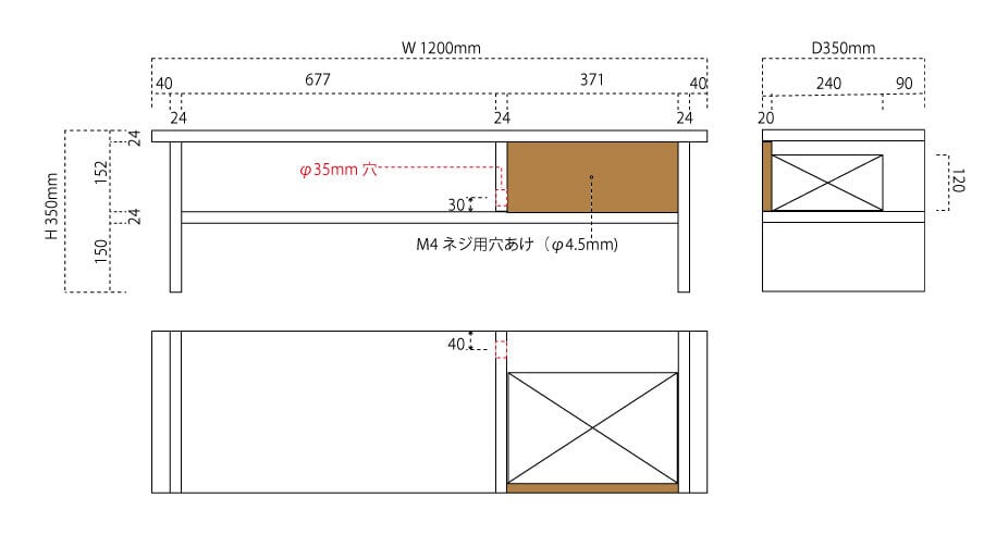 ・穴あけ:仕切り板(穴中心:棚板から30↑、背面から40mmのところにφ35mm)
