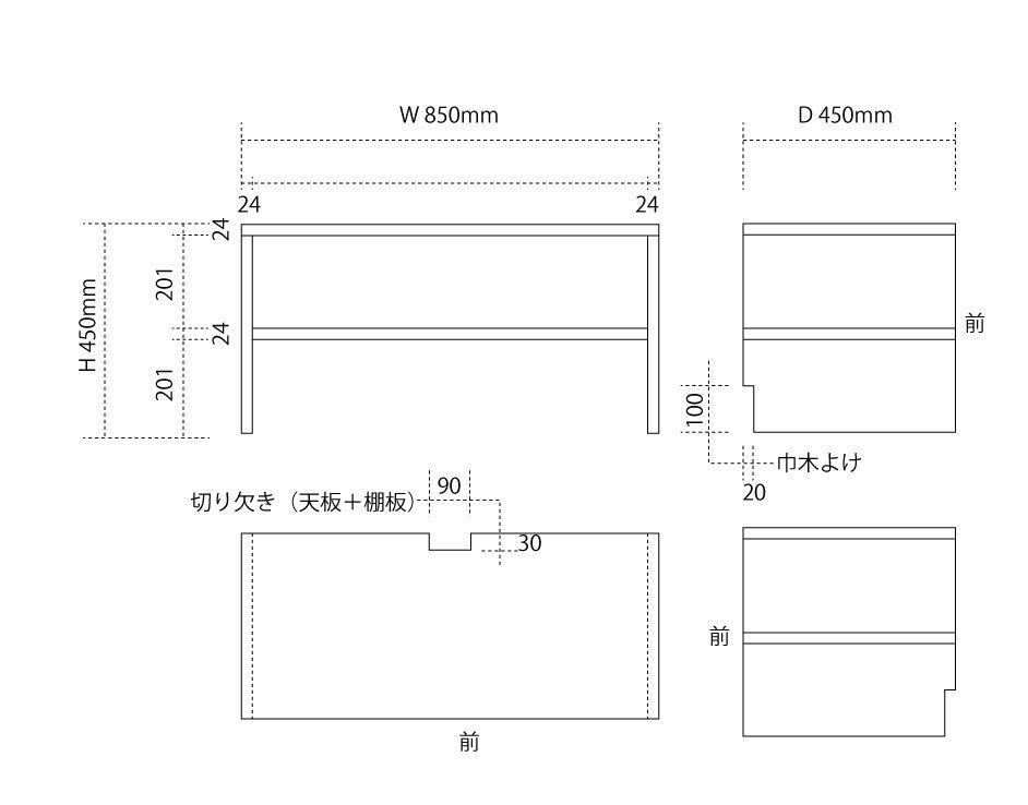・切り欠き:天板および棚板背面中央部分に「30*90mm」